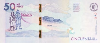 En el reverso del billete hay "figuras de los pueblos que ancestralmente han habitado en la Sierra Nevada de Santa Marta, que ha sido reconocida por la Unesco como reserva de la biósfera de la humanidad", explicó Uribe.