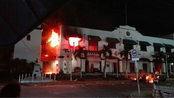Luego de que por la mañana decenas de personas irrumpieron en la la alcaldía para causar daños materiales mientras que en la calle incendiaron una patrulla, al caer la noche las protestas arreciaron y prendieron fuego a una parte de las instalaciones.