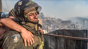 Y, además, la catastrofe ya dejó una imagen representativa. El fotógrafo Fidel Rudolffi tomó una captura del momento exacto en que un bombero que trabajaba en el incendio veía cómo su propia casa estaba en llamas. El retratado es Juan Carlos Espinoza, un bombero voluntario de Valparaíso.