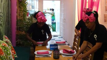 También son coquetos los trajes de las internas que atienden las mesas: camisa y pantalón negro que combinan con un turbante y sandalias rosadas.