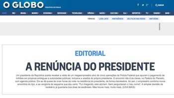 "Un presidente de la República acepta recibir a un megaempresario objetivo de 5 operaciones por parte de la Policía Federal, casos que salpican a políticos e —incluso— a aliados del propio presidente. La visita no aparece en la agenda pública. Se realiza casi de noche, en la residencia del presidente, de manera clandestina. Al salir, el empresario acuerda nuevos encuentros. Llegó, nadie le preguntó siquiera su nombre. La simple decisión de recibirlo ya constituye un escándalo. Pero había más… mucho más", comienza O'Globo su lapidario editorial titulado "La renuncia del Presidente".