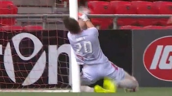 Desconcertado, Hall tuvo que volver tras sus pasos y con la vista fija en el balón saltó y alcanzó a desviarlo al tiro de esquina. Sin embargo, terminó estrellando su cabeza contra el poste izquierdo.