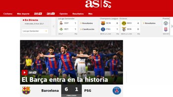 "El Barça entra en la historia", titula el diario As, de España, con la foto del inesperado héroe de la noche: Sergi Roberto, autor del sexto gol en el último minuto de partido, que le dio el boleto al equipo dirigido por Luis Enrique a los cuartos de final de la Champions League.