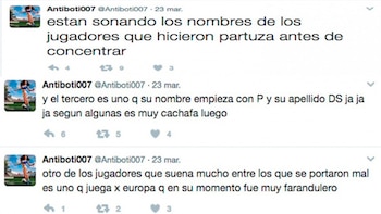 "Están sonando los nombres de los jugadores que hicieron partuza antes de concentrar", fue el primero de los mensajes que publicó la cuenta oficial reconocida por publicar escándalos deportivos.