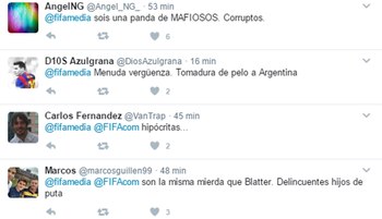 "Mafiosos, corruptos", escribió un usuario. "Es una vergüenza", denunció otro. "Hipócritas", agregó un tercero. La mayoría de los reproches estaban vinculados con el pasado turbio de la entidad. Y llegaban especialmente desde la Argentina, pero también desde España, Brasil y el Reino Unido.
