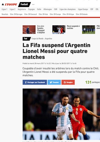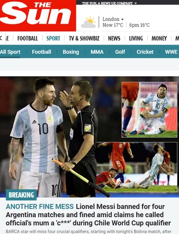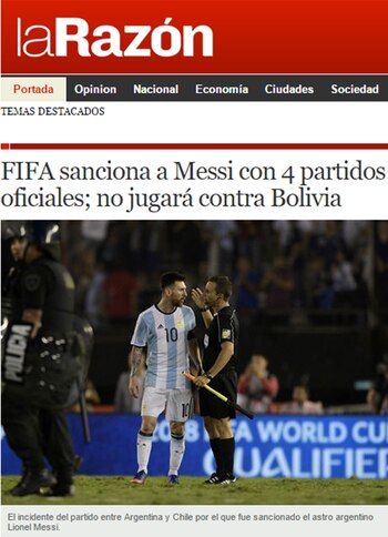 El capitán de la Albiceleste fue sancionado de oficio por violar el artículo 57 del Código de Disciplina al insultar a uno de los jueces de línea del triunfo por 1-0 ante Chile en las Eliminatorias Sudamericanas. La FIFA lo suspendió y se perderá los partidos ante Bolivia, Uruguay, Venezuela y Perú. Podrá volver en la última fecha ante Ecuador, de visitante.