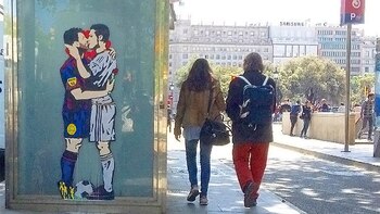 La imagen se repite una y otra vez en el paseo de Gràcia, en donde se puede ver al argentino de puntas de pie, y con una rosa en la mano, para llegar al rostro del portugués, quien le agarra la nuca para que el beso resulte más apasionado.