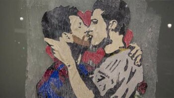 El amor es ciego, así tituló su obra el controvertido artista urbano Tvboy, quien pintó al astro del equipo azulgrana, Lionel Messi, y a la estrella del Real Madrid, Cristiano Ronaldo, fusionándose en un apasionado beso.