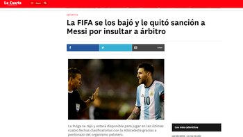 "La FIFA se los bajó y le quitó la sanción a Messi por insultar a árbitro", tituló La Cuarta, de Chile, y consideró que fue una decisión equivocada la que se tomó con el futbolista argentino.