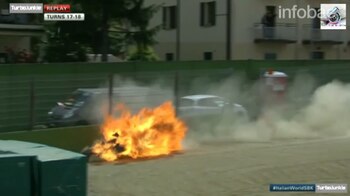 El accidente es BRUTAL. Lowes toca a Laverty, la moto sale disparada y acaba en el muro, ardiendo. #WSBK #ItalianWorldSBK pic.twitter.com/uS56b6flcS