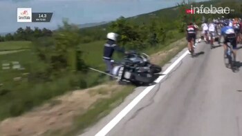 La novena etapa del Giro de Italia se vio afectada por un insólito accidente, producto de una moto de policía mal estacionada en el arcén izquierdo de la carretera.