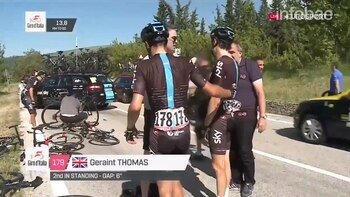 En ese momento varios de los corredores sufrieron las consecuencias de una moto mal estacionada. Wilco Kelderman fue uno de los más afectados, pero junto a él, también cayeron los líderes del Team Sky, Mikel Landa y Geraint Thomas, quienes pudieron reemprender su marcha con evidentes gestos de dolor y tras varios segundos perdidos.