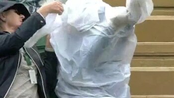 Mientras el partido se detenía durante algunos minutos, quienes seguían la transmisión de la BBC disfrutaron de una batalla épica de algo más de 40 segundos de un espectador contra un impermeable descartable (al que los anglosajones llaman "poncho") que intentaba utilizar para protegerse de la lluvia.