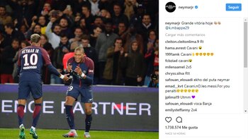 "Gran victoria hoy", exclamó Neymar Jr. en su cuenta de Instagram junto a una foto en la que solo aparecen él y el joven francés, autor del segundo gol. Un mensaje que podría apuntar a su enojo con el uruguayo. Así también lo entendieron los fanáticos que comentaron el posteo.