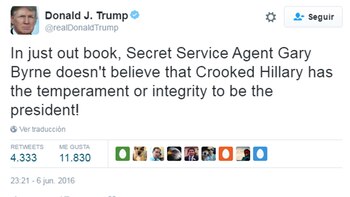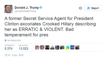 El magnate neoyorquino publicó en su cuenta oficial de Twitter una anécdota de un ex agente del Servicio Secreto -los encargados de proteger al presidente de los EEUU- que cuidó del presidente Bill Clinton y describió a su esposa como "errática y violenta". Trump no dudó en usar a su favor esa calificación para remarcar que ese carácter "torcido" es "malo para ser presidente". Gary Byrne es el agente que escribió sus memorias acerca del tiempo que prestó servicio en la Casa Blanca durante la administración de Clinton. El libro tiene fecha de lanzamiento para el 28 de junio, sin embargo, ya es número uno en la preventa digital, y Trump no dudó en adelantar algunos hechos para llevar a su favor el debate sobre el carácter de los candidatos presidenciales.