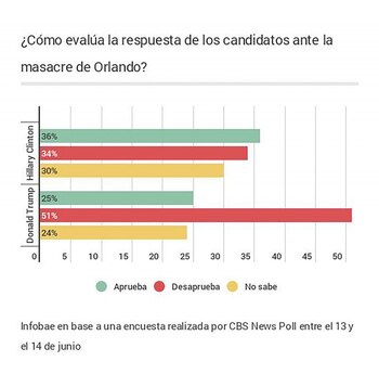 No debería llamar la atención que el 51% de los estadounidenses rechace su reacción ante el ataque de Orlando, frente a un 25% que la aprueba, según una encuesta de CBS News Poll. En cambio Hillary, más diplomática, al menos no salió perdiendo: a un 36% le parece bien lo que dijo, contra un 34% que piensa lo contrario.