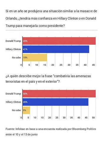 Cuando Bloomberg preguntó cuál de los dos rivales en las próximas elecciones genera más confianza para manejar una crisis como la desatada por los ataques recientes, el 45% se inclinó por él, contra un 41% que lo hizo por Clinton. Además un 50% lo identifica como alguien que "combatiría las amenazas terroristas en el país y en el exterior", frente a un 45% que la menciona a ella. Pero el discurso del empresario inmobiliario, desprovisto de todo límite, encierra muchos riesgos para sus propias aspiraciones.