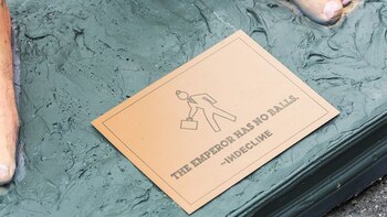 En su base, la estatua tiene una pequeña placa grabada que dice "El emperador no tiene bolas" y está firmada por un tal Ginger.