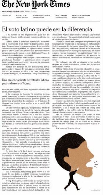El diario The New York Times, que ya había manifestado su posición a favor de Hillary Clinton, publicó este domingo en su edición impresa un editorial en español en el que invitó a la comunidad latina a votar en contra del magnate republicano Donald Trump en las próximas elecciones de noviembre.