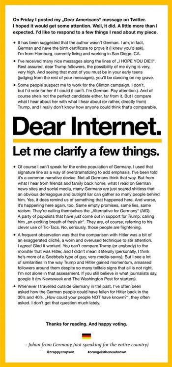 Los ojos del mundo estarán puestos esta semana en lo que suceda el martes 8 de noviembre en las elecciones de Estados Unidos. Tal es la relevancia que supone la elección de un presidente norteamericano que un ciudadano alemán decidió advertir a los votantes americanos sobre los riesgos de elegir por Donald Trump.