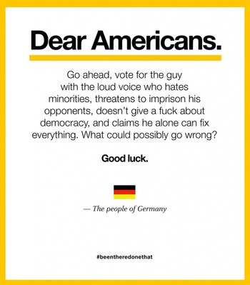 El mensaje fue publicado el pasado viernes por Johan Franklin, quien advirtió: "Queridos americanos, vayan, voten por el hombre de voz fuerte que odia a las minorías, amenaza con encarcelar a su oponente, no le importa la democracia, y afirma que sólo él puede arreglar las cosas. ¿Qué podría salir mal? Buena suerte".