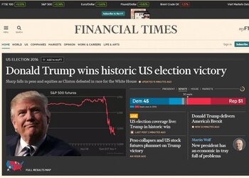 "Donald Trump gana una histórica elección de EEUU", escribe el Financial Times. Detrás de la foto del candidato, un gráfico muestra la caída de los mercados tras la noticia.