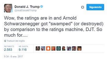 "Wow, llegaron los ratings y Arnold Schwarzengger se "ahogó" (o quedó destrozado) por la máquina del rating, DJT (Donald J. Trump)", se ufanó el presidente electo de los EEUU en su cuenta de Twitter. Y agregó: "Y eso que sólo se comparó su temporada 1 con la 14 mía… compárenla con mi primera. Pero a quién le importa, si apoyó a Kasich y a Hillay".