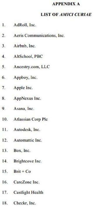 Amazon y Expedia no participaron en el amicus curiae porque presentaron antes sus casos por separado y, además, la empresa de Jeff Bezos también es testigo en la causa principal del estado de Seattle contra el presidente Trump. La lista incluye además algunas empresas ajenas al campo de la tecnología, como la gastronómica Chobani y la textil Levi Strauss.