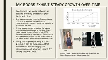 "Mis pechos muestran un constante crecimiento a lo largo del tiempo", resaltó. Para demostrarlo, Lizzy realizó un "análisis estadístico" que graficó los cambios del tamaño de su sostén en los últimos años, con datos de regresión, aunque se mostró excesivamente confiada en que el crecimiento continuaría en la próxima década. "Puede extrapolarse que cada seno tendrá aproximadamente la circunferencia de una cabeza humana en el año 2025", calculó.