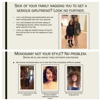 "¿Harto de que tu familia te insista para que consigas una novia seria? No busques más", ofreció la joven, describiéndose como una "tentadora conversadora" capaz de sostener un diálogo fluido con sus padres. En ese sentido, indicó que se viste apropiadamente para reuniones familiares y tiene un sentido del humor "arriesgado pero agradable que se ganará la aprobación de tu madre".