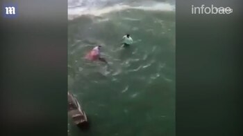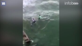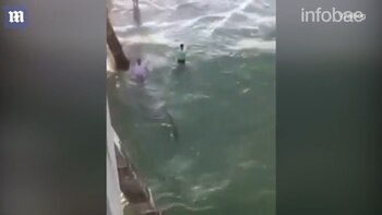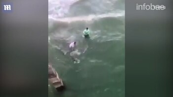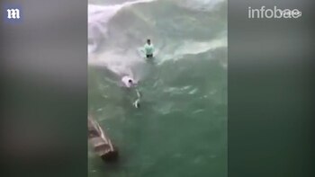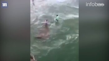 En la grabación, dos hombres se aproximan al animal, que estaba enganchado en una línea de pesca, para tirarlo hasta la costa. Sin medir las consecuencias, uno de ellos se atrevió a jalarlo por la cola.