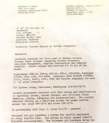 El curriculum vitae de Gates está exhibido en el museo Living Computers en Seattle y fue recogido por el periodista especializado en el mundo digital, Harry McCracken, quien lo publicó en su cuenta de Twitter.