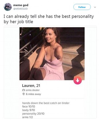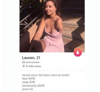 Una joven estadounidense que tiene un solo brazo ha cautivado los corazones de miles de hombres después de bromear en su perfil de Tinder de que era una "arms dealer" (un juego de palabras en inglés con "traficante de armas" y "comerciante de brazos").