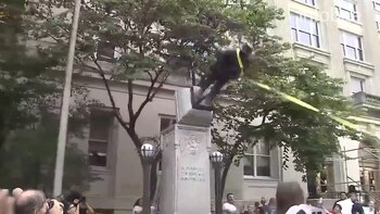 Los manifestantes ataron una soga al cuello de la estatua y la derrumbaron. Una vez en el suelo, la patearon.