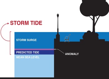 El Centro Nacional sobre Huracanes (NHC) distingue la mortífera storm surge del aumento normal del nivel del mar por una tormenta: "Es un aumento anormal del agua". Y puede causar "inundaciones extremas en las áreas costeras, en particular cuando la marejada ciclónica coincide con una marea alta normal, lo cual eleva el agua hasta 6 metros (20 pies) o más".