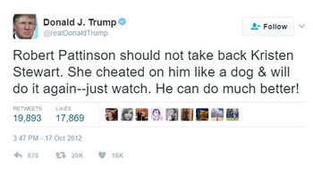 "Robert Pattinson no debe volver con Kristen Stewart. Lo engañó como un perro y lo hará de nuevo, sólo espera. Puede tener algo mejor", "Termina con Kristen Stewart en un par de años me vas a agradecer. Sé inteligente Robert", fueron algunos de los tuits de Trump al respecto.