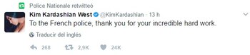 "A la policía francesa, gracias por su difícil e increíble trabajo", tuiteó la esposa del rapero y productor estadounidense Kanye West.
