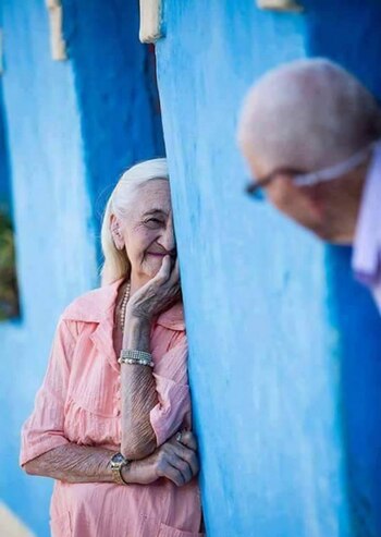 Las fotografías muestran a una pareja de ancianos que juega, sonríe y se abraza cariñosamente en la celebración de su aniversario de casamiento.