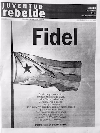 Juventud Rebelde eligió en su portada de este lunes simplicar este momento con una palabra: "Fidel", acompañada por una imagen de la bandera cubana.