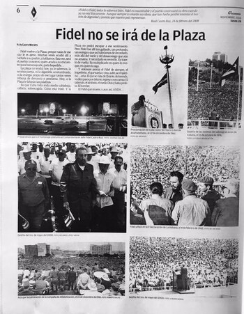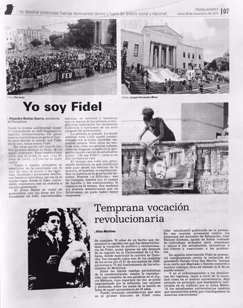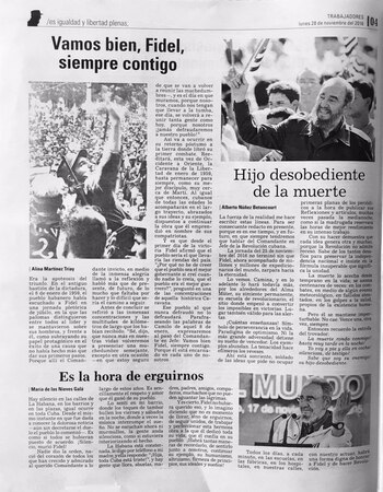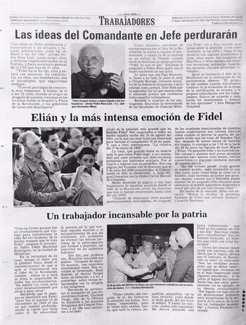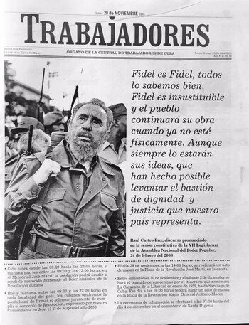 "Fidel es Fidel, todos lo sabemos bien. Fidel es insustituible y el pueblo continuará su obra cuando ya no esté físicamente. Aunque siempre lo estarán sus ideas, que han hecho posible levantar el bastión de dignidad y justicia que nuestro país representa". Así abre su edición de este lunes el periódico Trabajadores, con una fotografía del comandante con un rifle.