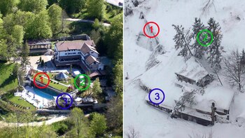 La imagen del antes y el después muestra cómo la nieve sepultó la lujosa piscina climatizada (1, en la imagen) con vistas a la montaña. Nada queda de la entrada al hotel Rigopiano y tan sólo se divisan algunos pinos (2) de la entrada. La zona de la confitería de dos plantas, lindera a la piscina vidriada (3), también quedó bajo el alud.