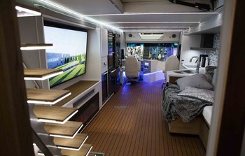 Para entretenimiento durante el mal tiempo, cuenta con tres televisores de pantallas de 75 pulgadas que pueden soportar fuertes vibraciones y múltiples sistemas de computación. En el baño hay una ducha inteligente.