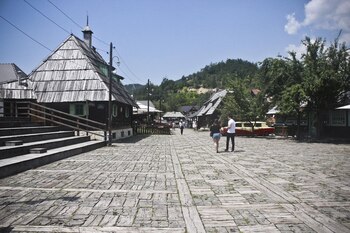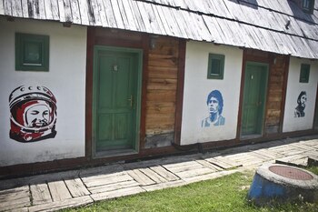 Pese a la retórica anticapitalista de su creador, como en cualquier parque temático de atracciones hay que pagar para entrar al pueblito. Es sábado y las callejuelas están repletas de cámaras de fotos que disparan incesantes flashes bajo el tibio sol. Hay restaurantes, tiendas de recuerdos y artesanías, un lujoso hotel con spa, canchas de tenis y turistas, muchos turistas que deambulan lentamente, compran, comen, fuman, beben. Por momentos la escenografía confunde, como si el pueblito fuese realmente tan antiguo como tradicional, encantador y romántico, un enclave de fantasía en medio de los Balcanes. Pero no. Detrás de todo hay un mensaje político.