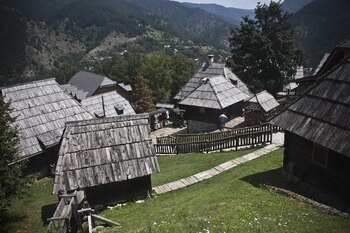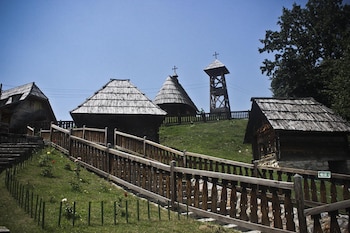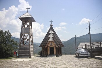 La pequeña iglesia cristiana ortodoxa que corona el complejo de Drvengrad aporta un componente local nacionalista y choca contra los orígenes musulmanes del director nacido en Bosnia y convertido al cristianismo en 2005. El nombre Emir es evidentemente islámico. A nadie parece importarle, quizás porque el pueblito, con sus tiendas y cafés, podrá ser artificial pero eso no le quita lo afable y pintoresco. Y la vista al montañoso paisaje que lo rodea impresiona.
