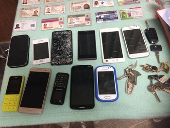 Entre los objetos está una variedad de teléfonos móviles, zapatos, mochilas, documentos oficiales como un pasaporte de un ciudadano francés, muletas ortopédicas, cascos de motociclistas, televisores viejos y carriolas para bebé.