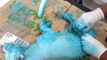 La perrita, a la que las redes llaman ya "la Perrita Azul", fue rescatada de un aljibe donde la dejaron los agresores después de haberla bañado con pintura de aceite de color azul, herido con un picahielo y obligado a tragar solventes, según reveló la autopsia.