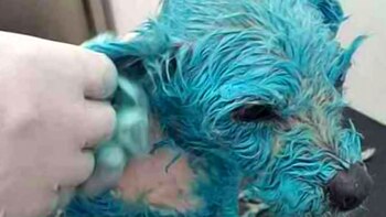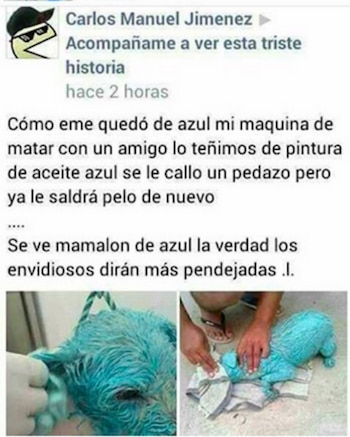 Hace unos días, un usuario de Facebook presumió de fotos con la cachorra pintada de azul, burlándose de lo bien que le había quedado, pero ante los ataques eliminó su perfil.