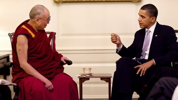 En febrero de 2014, la Casa Blanca tuvo la precaución de subrayar que el dalái lama era recibido "como un jefe espiritual y cultural respetado internacionalmente", dando a entender que no era invitado como dirigente político. Aquel encuentro fue también cerrado a la prensa. Pese a las precauciones, Beijing calificó de inmediato la entrevista como "una grosera ingerencia" en sus asuntos internos.