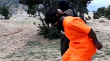 Sobre el final del clip de más de 12 minutos, aparece uno de los "cachorros del califato" –así se llama a los jóvenes reclutados por el Estado Islámico- guiando a la víctima, con los ojos vendados, a un área remota en la zona montañosa.