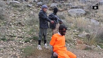Acto seguido, el niño yihadista desenfunda un arma y ejecuta a la víctima de un disparo en la cabeza.